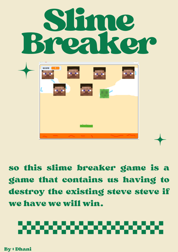 ok so my new game is called Block breaker so in this game it contains about we have to destroy steve and this I made it in 1 day or 2 days because making this game is easy but there are a lot of bugs and how to play this game is also quite easy just press A to go left and press D to go right if we have destroyed steve everything we will win but if we don’t destroy it but the slime goes into the lava we will lose it