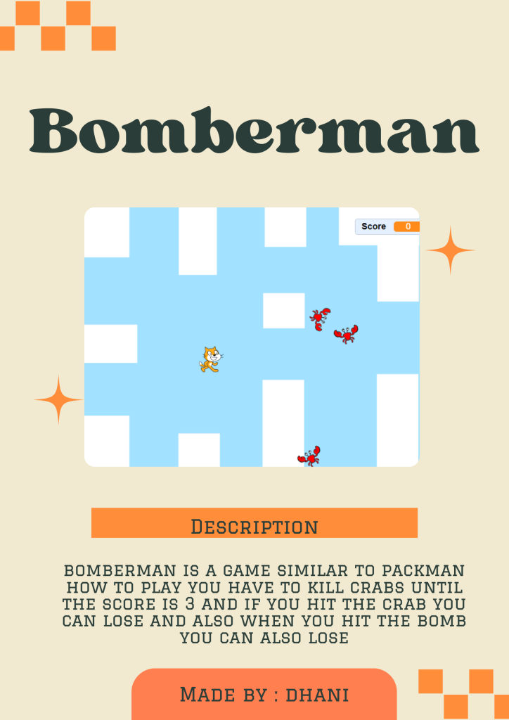 okay so this is my new game the name is bomberman bomberman this is similar to packman game and the way to play this game is you have to collect 3 points in this game and if you hit the crab you will lose and the same if you hit the bomb you will lose and I made this game easy but I play this game hard and sorry if this is long demo video because it is hard.