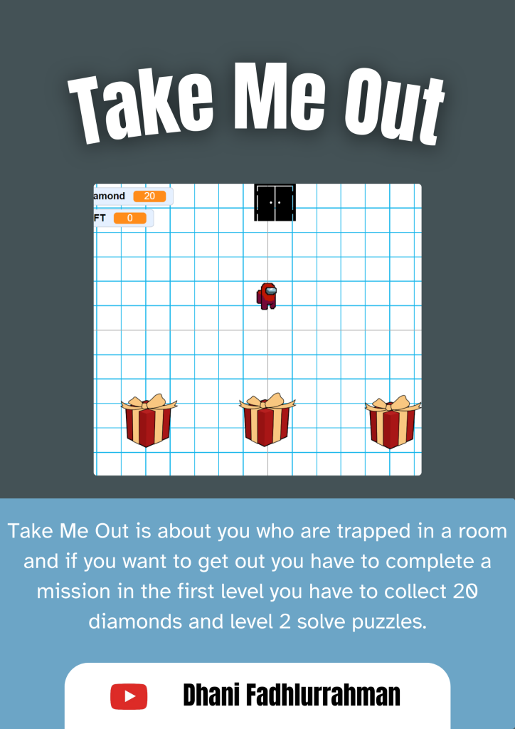 Hello guys this is my third game and now the title of the game is Take Me Out so this game contains about we have to get out of a room by completing missions at the first level we have to get 20 diamonds so that the door opens and go up to level 2 which contains we have to solve the puzzle there and we can be free from the room.