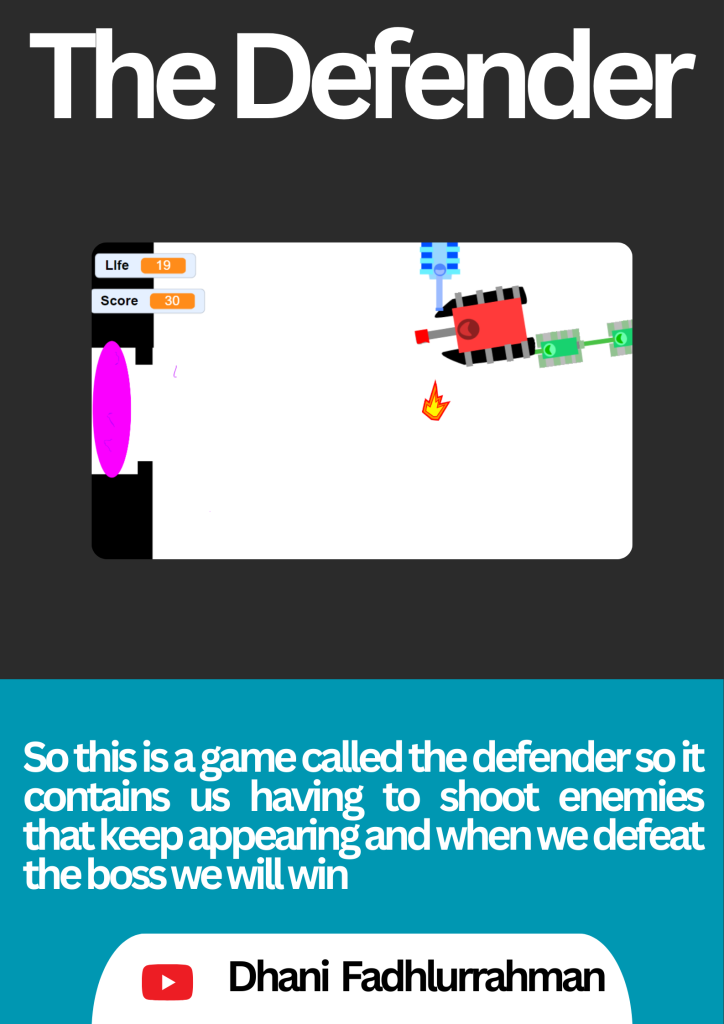 okay so this is my new game and this is the name is the defender and of course I made this in scratch and this game contains that we have to defend from enemies and also the boss and in this game there are 3 levels the first is easy the second is medium and the last is hard and how to play the game W,A,S,D to move it and space bar to shoot it