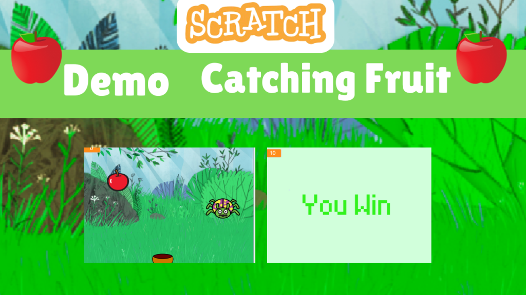 This fruit catching game is made from a game engine, namely the scratch engine or scratch application with the theme of catching falling fruit using a bowl and avoiding ladybug sprites, so how to play this fruit catching game is that there is a program that can when we press the right arrow the sprite bowl goes to the right and if we press the left arrow it will go to the left and when we catch fruit we get +1 point and if we get a ladybug we will get -1 point